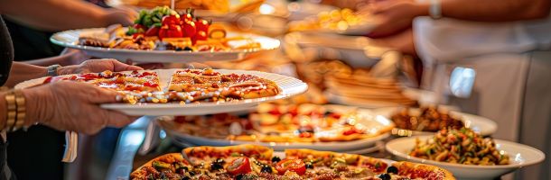 Packages include your choice of five pizza styles and one salad, served unlimited for a two-hour window at $39 per person (50-guest minimum), or $19 per person for groups over 50. Each additional service hour is $8 per person.